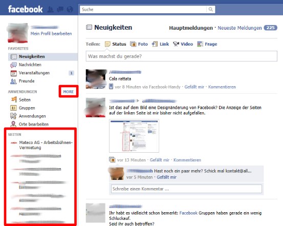 Die neue Seitenleiste zeigt von oben nach unten: Favorites, Anwendungen, Seiten. Damit unterscheidet sie sich von der aktuellen Seitenleiste, welche Favorites, Gruppen und Anwendungen zeigt. Neu ist auch, dass die einzelnen Bereiche nun Überschriften tragen. Neben dem Wegfall der Gruppen aus dem Menü ist besonders die Auflistung der Pages interessant. Hier werden alle Seiten gezeigt, bei denen der Nutzer Administrator ist. So wird der Zugriff auf diese Seiten erleichtert. Wenn wir uns hier was wünschen dürften, wäre es eine Anzeige hinter jeder Seite wie viele neue Wallposts noch auf ihre Sichtung warten. Ein weiteres Feature scheint sich hinter dem „MORE“ Link bei den Anwendungen zu verbergen: