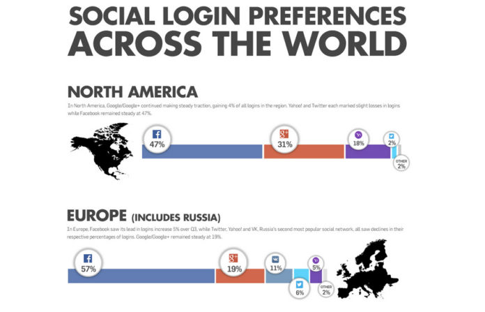 - In Europa sitzt Facebook auf 57 % der Social Logins, gefolgt von Google+ mit 19 % und VKontakte mit 11 % (in der Statistik wird Russland zu Europa gezählt)