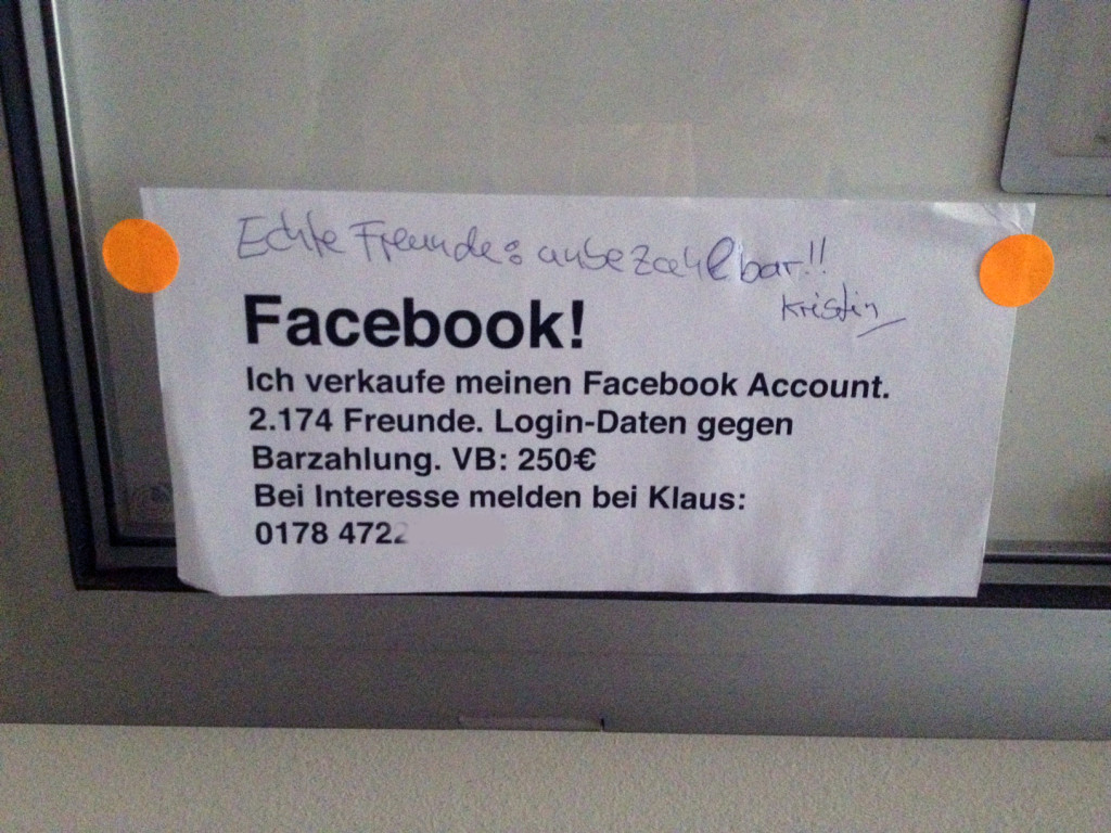In den vergangenen Wochen machte auf Facebook ein Foto von „Notes of Berlin“ die Runde. Darauf zu sehen: ein Aushang mit einem Verkaufsangebot für einen Facebook Account. 2100 Freunde für 250 Euro – ein Schnäppchen.