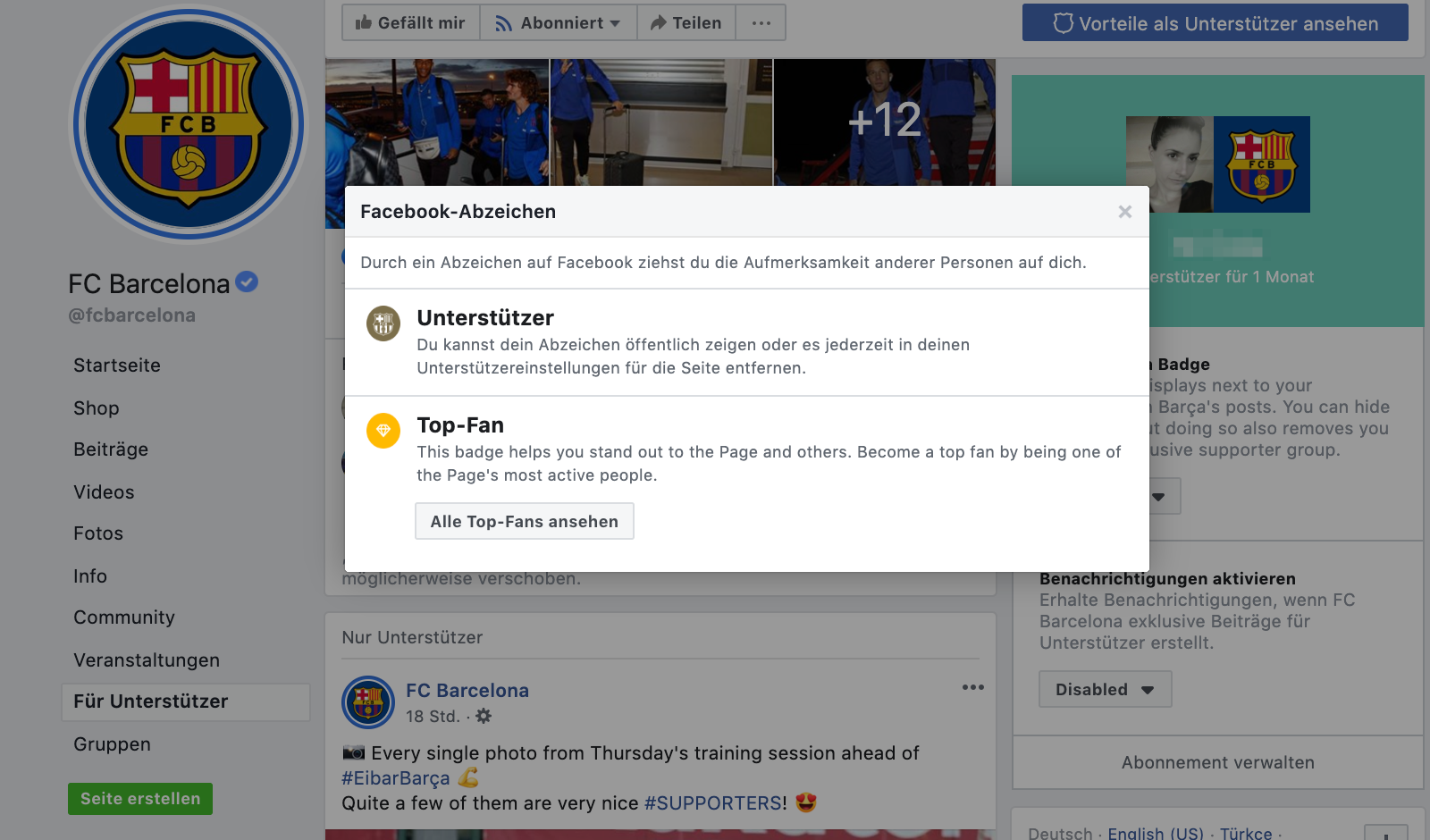 Das Abonnement ist bestätigt und der Kauf abgeschlossen, nun ist der User offizieller „Unterstützer“ des FC Barcelona. Aktuell unterstützen über 10.000 Follower den Klub durch eine Mitgliedschaft (Stand: 20.10.2019). Ein zusätzlicher Reiter auf der linken Spalte der FC Barça-Fanseite wird durch die Subscription auf Facebook mit der Beschriftung „Für Unterstützer“ freigeschaltet. Zudem erscheint auf der rechten Seite ein extra Feld in türkis mit dem Vereinslogo neben dem Profilbild. Hier hat man die Möglichkeit Benachrichtigungen und die Anzeige des Fan-Badges zu aktivieren.