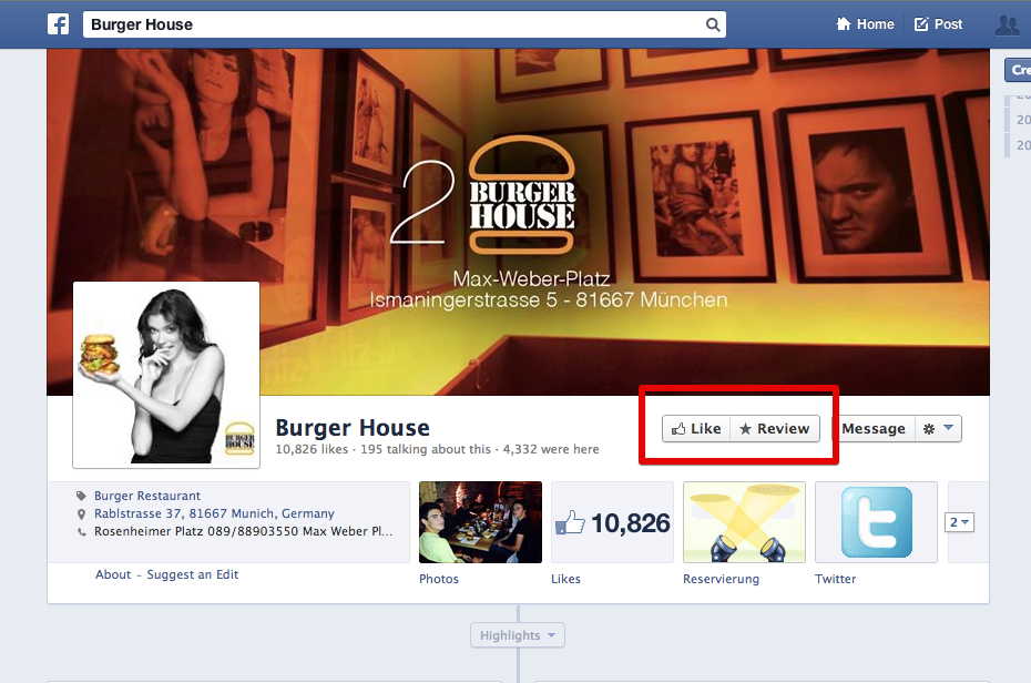 Gestern ging es schon durch einige Blogs, und auch wir haben auf AllFacebook.com darüber berichtet. Facebook hat damit begonnen, einen „Review“ („Rezensieren“) Button auf einigen Facebook Pages mit anzuzeigen. Neu ist dabei vor allem die Gewichtung der Funktion in direkter Nähe zum Like-Button, denn natürlich gab es zuvor schon Rezensionen auf Facebook. Diese wurden und werden allerdings erst ein Stück weiter unten auf der Timeline gezeigt.