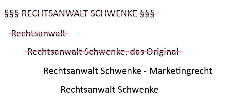 - Gattungsbegriffe und Kategoriebezeichnungen sind unerwünscht. So darf eine Seite nicht „Autoreparaturen“ oder „SEO-Marketing“ genannt werden.