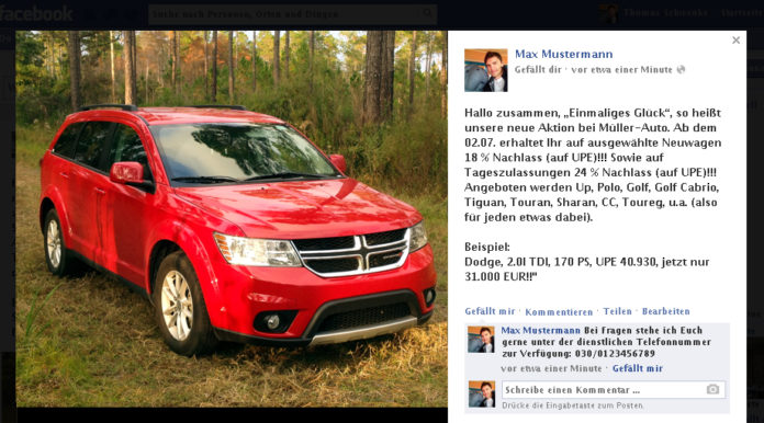 Bei dem Mitarbeiter des Autohauses handelte es sich um einen Neuwagenverkäufer. Wohl auch um seinen Absatz zu fördern, veröffentlichte er auf seiner persönlichen Facebook-Chronik das Bild eines „zum Verkauf herausgeputzten“ Autos, begleitet von dem folgenden Text: