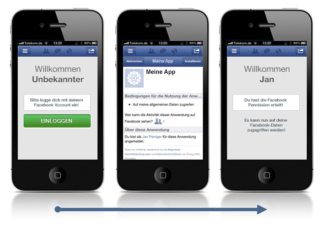 Nutzt man das Javascript-SDK von Facebook muss man sich hier keine weiteren Gedanken machen im Vergleich zu einer „normalen“ Facebook-App. Das Gerät, das die App nutzt wird automatisch erkannt und so z. B. ein mobile Permission-Dialog statt dem Standard-Permission-Popup aufgerufen. Hier ermöglicht Facebook uns recht einfach einen runden Workflow zu erstellen.