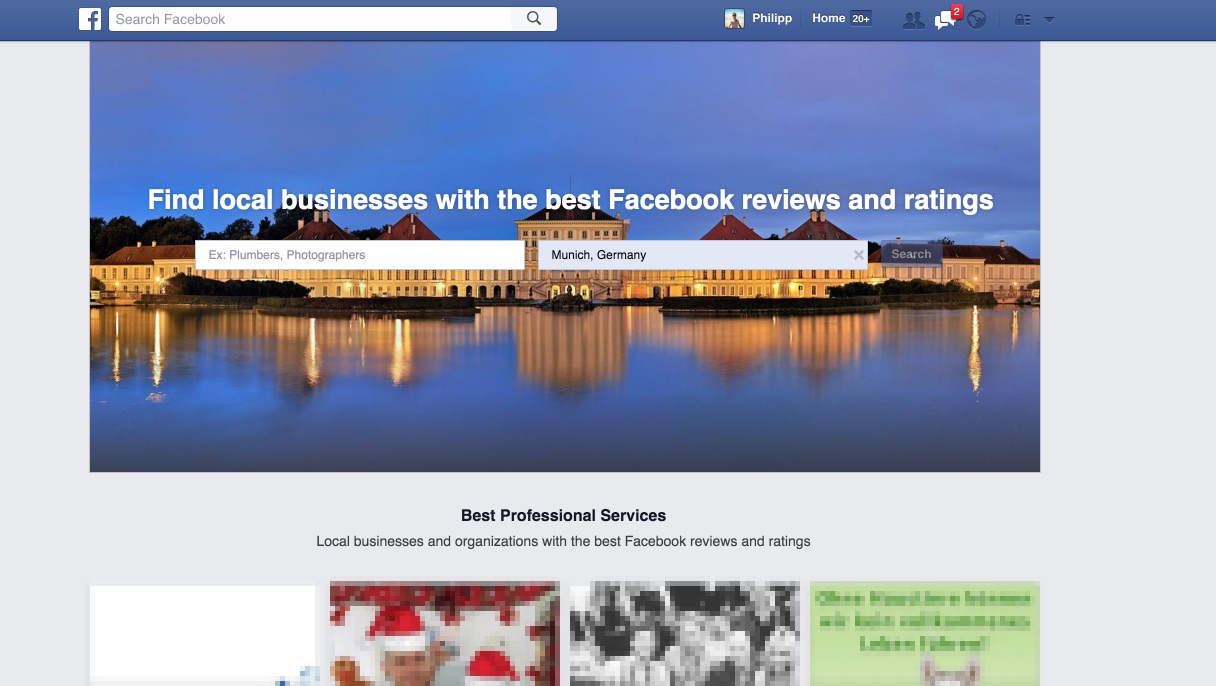 Das neue Portal erlaubt die Suche nach Dienstleistungen in der Nähe. Im emotional gestalteten Header kann man sich über das entsprechende Stichwort und die Auswahl der Stadt die verschiedenen Dienstleister anzeigen lassen. (siehe Screenshot oben) In der Übersicht werden außerdem acht Kategorien mit Bild angezeigt und weitere Dienstleistungskategorien sind am Seitenende als Liste vorhanden. Die Kategoriebilder werden dabei, sofern vorhanden, mit passenden Bildern aus dem Freundeskreis bestückt. Man sieht also zum Beispiel ein Bild eines Freundes vom Fotograf um die Ecke.