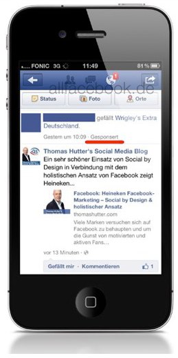 Im März waren die ersten Anzeigen vom Facebook im Newsstream zu sehen und nun hat Facebook offenbar auch mobil nachgezogen. Die „gesponsorten Meldungen“ aus dem Newsstream erscheinen nun auch auf den mobilen Endgeräten der Nutzern. Dies ist komplett unabhängig davon ob der Nutzer die Android/iPhone App nutzt oder auf m.facebook.com surft. Verwunderlich ist dieser Schritt nicht, denn Facebook hatte dies auf der fmc in New York bereits angekündigt.