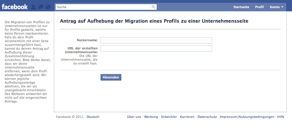 Der neue „Antrag auf Aufhebung der Migration eines Profils zu einer Unternehmensseite“ kann dann Hilfe schaffen, wenn unbeabsichtigt oder ausversehen (geht das?) ein privates Profil in eine Page verwandelt wurde. Die Seite verrät: