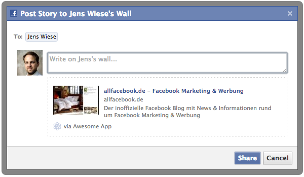 Komplett entfernt wird die Möglichkeit über die Graph API mittels der publish_stream Permission im Hintergrund auf die Chronik eines Freundes zu schreiben. Sehr begrüßenswert: Diese Möglichkeit wurde ohnehin mehr miss- als ge-braucht. Davon unberührt ist natürlich ein Posting auf die Chronik von Freunden von mittels JS-SDK, also mit dem altbekannten Publish-Dialog, wie im folgenden zu sehen. Diese funktioniert weiterhin.