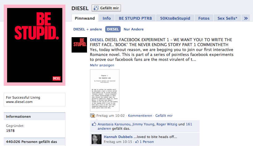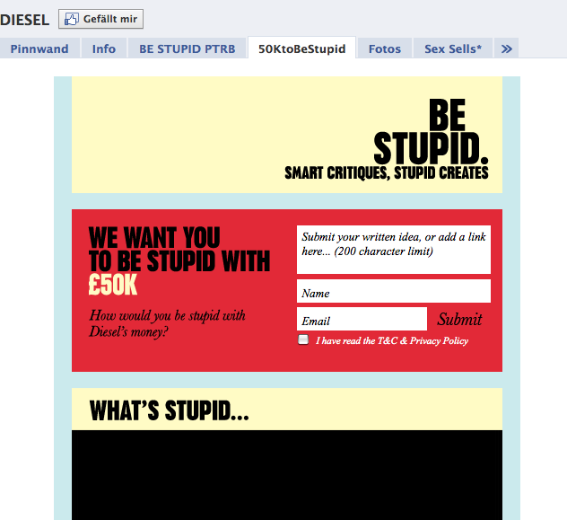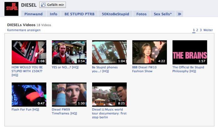Diesel hat zur Zeit 440.000 Fans auf Facebook und setzt dabei auf unterschiedliche Custom Tabs sowie auf Multimediainhalte. Die Tabs werden nicht nur innerhalb von Facebook genutzt sondern auch auf dem Webauftritt von Diesel beworben. Wir haben einige Screenshots zusammengestellt: