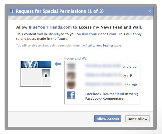 Die Kampagne ist aufwenidg gestaltet und nutzt die vielen Möglichkeiten von Facebook Connect gut aus. Beim ersten Aufruf erfolgt die Authorisierung mittels drei verschiedenen Authorisierungsanfragen, während die ersten zwei Anfragen völlig legitim und notwendig ist um die Kampagne so zu gestalten ist die Authorisierung der E-Mailadresse etwas unnötig da dies keinen effektiven Mehrwert für den Nutzer bietet.