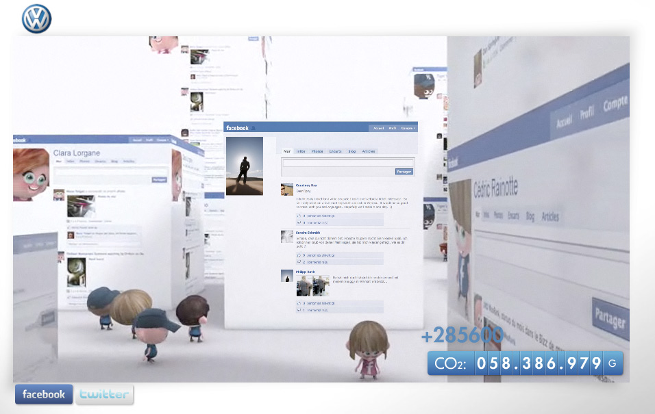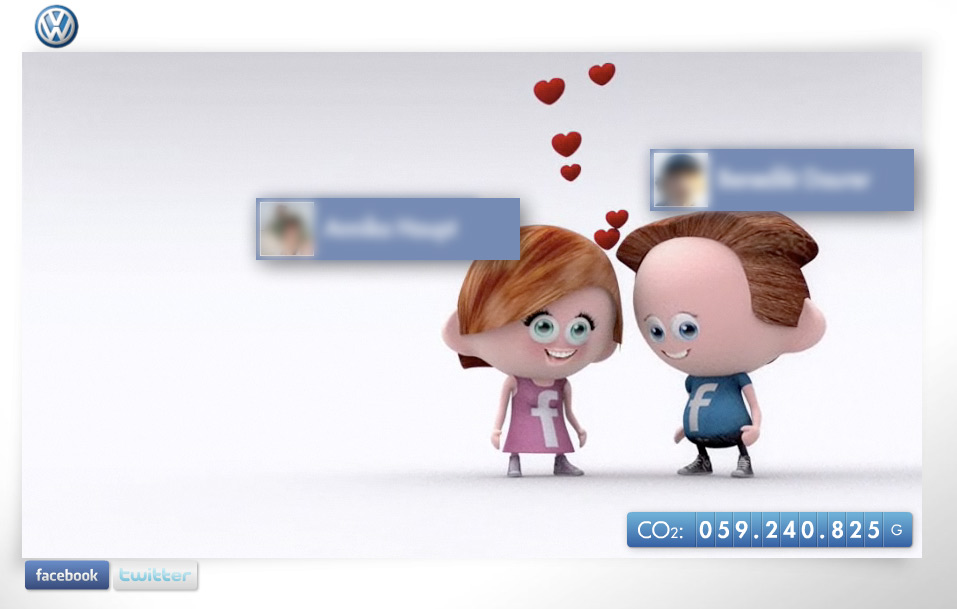 Gesehen haben wir die Integration von Facebook Daten in Flash Connect Anwendungen schon das ein oder andere Mal. Sei es bei der Promo für den aktuellen Sherlock Holmes Film oder aber zum CSI Staffelstart in Amerika. Mit Volkswagen bluemotion reiht sich nun eine weitere Werbekampagne ein. Unter www.blueyourfriends.com kann sich jeder facebook Nutzer die CO2 Bilanz seiner Freunde und derer Aktivitäten in einem animierten Flashfilm vorrechnen lassen. Zudem erfährt er, dass er seine eigene Bilanz mit einem VW bluemotion Modell aufbessern kann. Klar, irgendwo muss ja die Werbebotschaft sein.