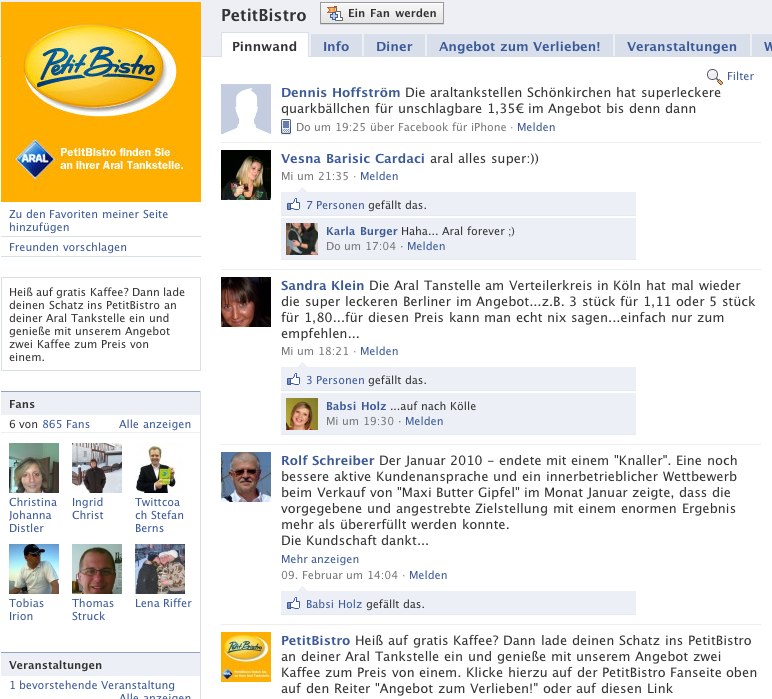 Besonders die Gestaltung eigener Tabs ist uns bei vielen Seiten aufgefallen. Diese gehen von einfachen „Fan werden“ Meldungen über digitale Werbebanner für das entsprechende Produkt bis hin zu kompletten Online Buchungsassistenten. Andere Seiten wiederum haben wir aufgenommen, da sie trotz relativ geringer Fanzahlen schon eine intensive Kommunikation und Interaktion mit den Fans aufbauen konnten.