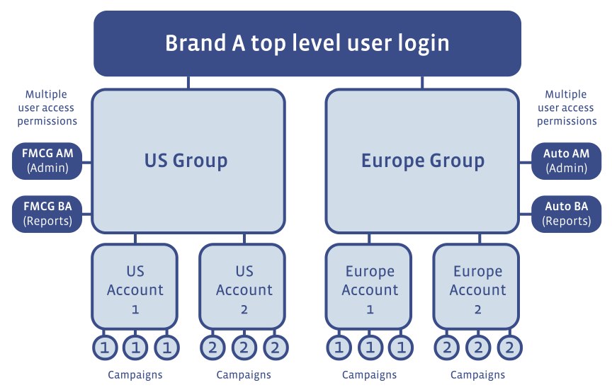 - Danach wird eine Struktur mit den Kontogruppen geschaffen die gut zur Agentur oder zum Unternehmen passt. Üblicherweise werden hier die verschiedenen Geschäftsbereiche abgebildet. Diesen Facebook Ads Kontogruppen werden Admins zugeordnet, welche Zugriff auf die einzelnen Unteraccounts der jeweiligen Gruppen besitzen sollen.