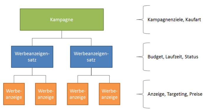 Auf Kampagnen-Ebene wird das Ziel der Kampagne festgelegt. Dadurch wird indirekt die grundlegende Struktur des Facebook-Anzeigenkontos vorgegeben. In einer Kampagne befinden sich ausschließlich Anzeigen mit einem Kampagnenziel. Hinsichtlich der Ziele wird eine Vorauswahl zur Verfügung gestellt. Diese umfasst unter anderem „Klicks auf die Webseite“, „Webseiten-Conversion“, „“Gefällt mir“-Angaben für eine Seite“ und „Interaktion mit Seitenbeiträgen“. Neben den Zielen wird auf der Kampagnen-Ebene auch die Kaufart festgelegt, dabei besteht die Auswahl zwischen Auktion und Fixed Price. In der Praxis hat sich herausgestellt, dass mit dem Auktionsverfahren häufig geringere Kosten pro Zielerreichung entstehen, wohingegen die Fixed Price-Abrechnung zu einer größeren Reichweite führen kann. Die Benennung der Kampagnen sollte aussagekräftig sein, um die Navigation besonders in großen Konten zu erleichtern. In diesem Zusammenhang hat es sich bewährt, das Ziel in den Kampagnennamen zu integrieren.