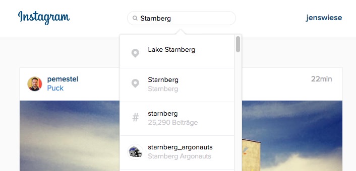 Die neue Suche ist, wie man oben im Screenshot sieht, „universal“. Das Bedeutet, es werden sowohl Orte als auch Hashtags und Nutzernamen mit aufgenommen. Damit sind Teile der Bildbeschreibung, die nicht als Hashtag hinterlegt sind oder aber auch entsprechende Kommentare nicht durchsuchbar. Die Ortssuche hatte Instagram gerade erst vor einem Monat auch in der mobilen Version veröffentlicht.