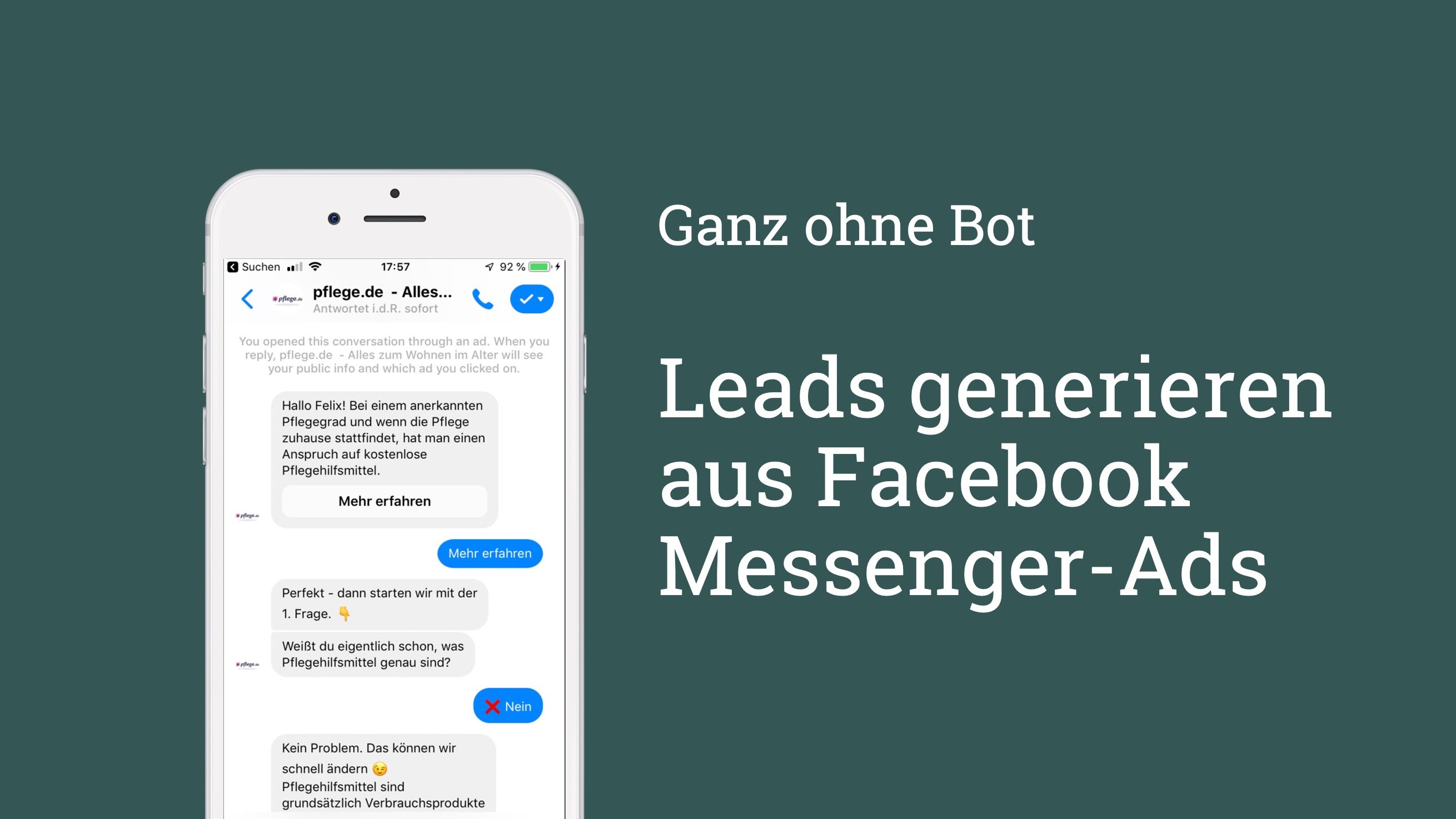 - Durch Klicken (Click to Messenger Ads) wird der Nutzer automatisch im Facebook Messenger von einem Chatbot angeschrieben
