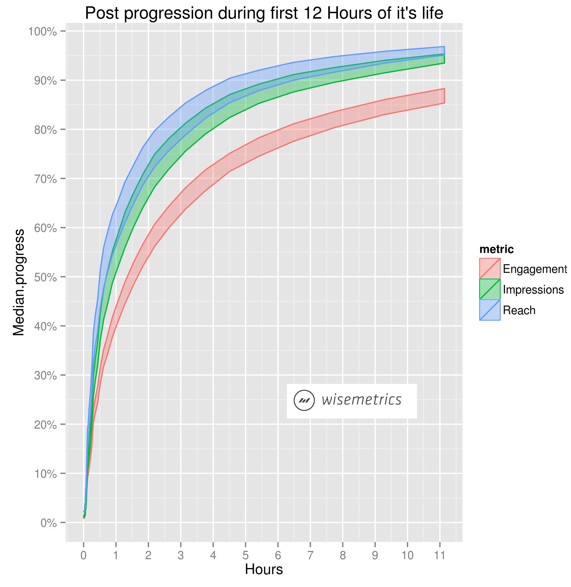 Gemessen wurden die Statistiken von Wisemetrics, die auch noch weitere interessante Details veröffentlichen. Die Interaktionsrate hängt natürlich direkt an der Reichweite des Posts. Dementsprechend erfolgen die meisten Likes, Shares und Comments innerhalb von 90 Minuten, genauer gesagt 50 % der Interaktionen entstehen in diesem Zeithorizont. Weitere fünf Stunden später werden dann 75 % aller Interaktionen erzeugt.