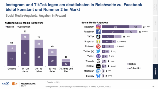 Die ARD/ZDF-Medienstudie untersucht seit Jahrzehnten, wie sich die Mediennutzung in Deutschland entwickelt. Die aktuelle Studie macht deutlich, Soziale Medien sind in Deutschland längst in der Breite angekommen. Immer mehr Menschen nutzen sie regelmäßig, Plattformen gewinnen oder verlieren an Relevanz und neue Formate prägen das Kommunikationsverhalten.